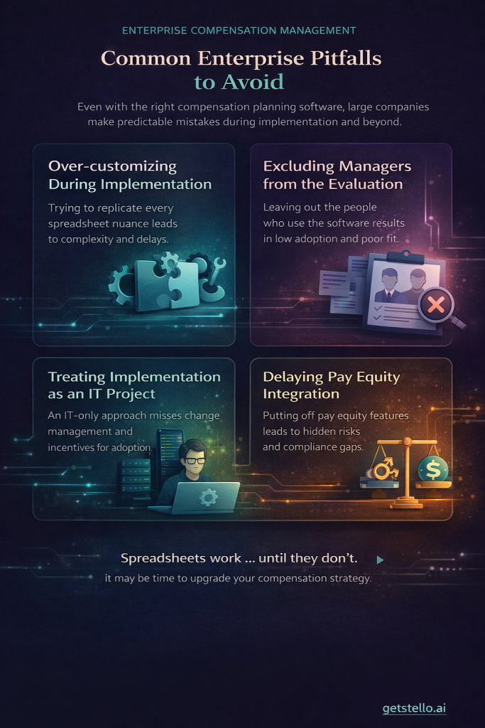 - → Common enterprise mistakes include over-customizing implementations, excluding managers from evaluation, and delaying pay equity integration until regulatory risk escalates