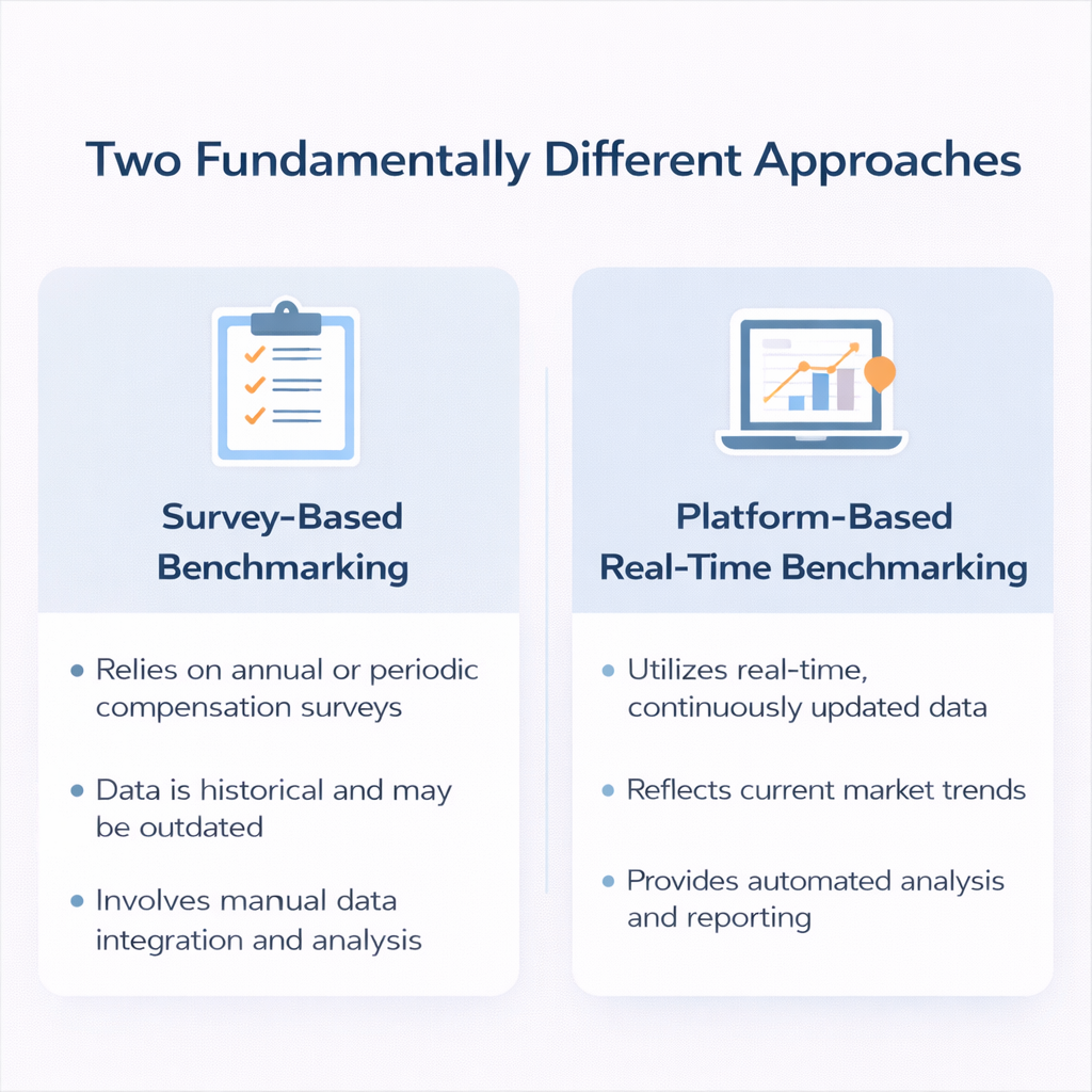The strength of survey-based benchmarking is rigor and breadth. The weakness is speed. Survey data is typically six to twelve months old by publication. The job matching process is manual. And accessing the data usually requires purchasing individual surveys at high cost, then doing the analysis work yourself.