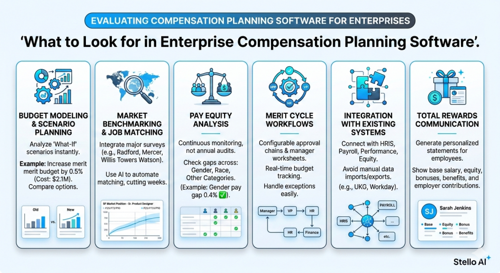 • Key evaluation criteria: budget modeling, market benchmarking, pay equity monitoring, merit cycle workflows, system integrations, and total rewards communication