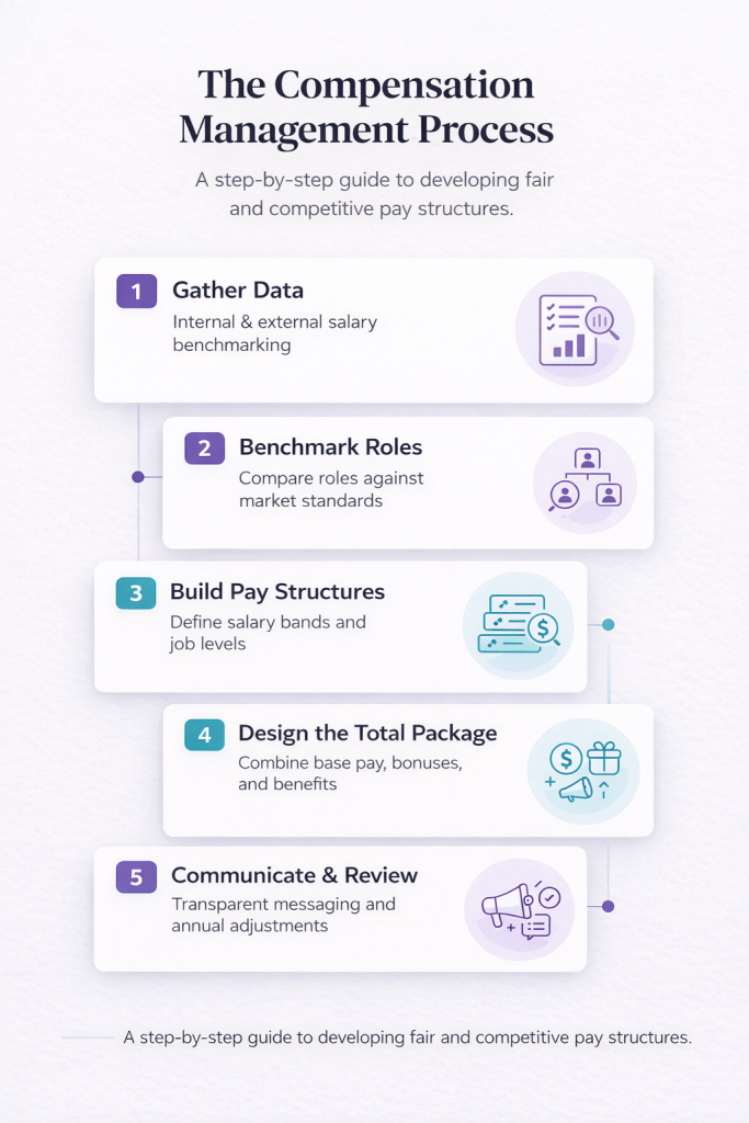 Compensation management isn’t a one-time task. It’s an ongoing cycle that HR revisits as the business grows, the market shifts, and employee needs evolve. Here’s how the process typically works: