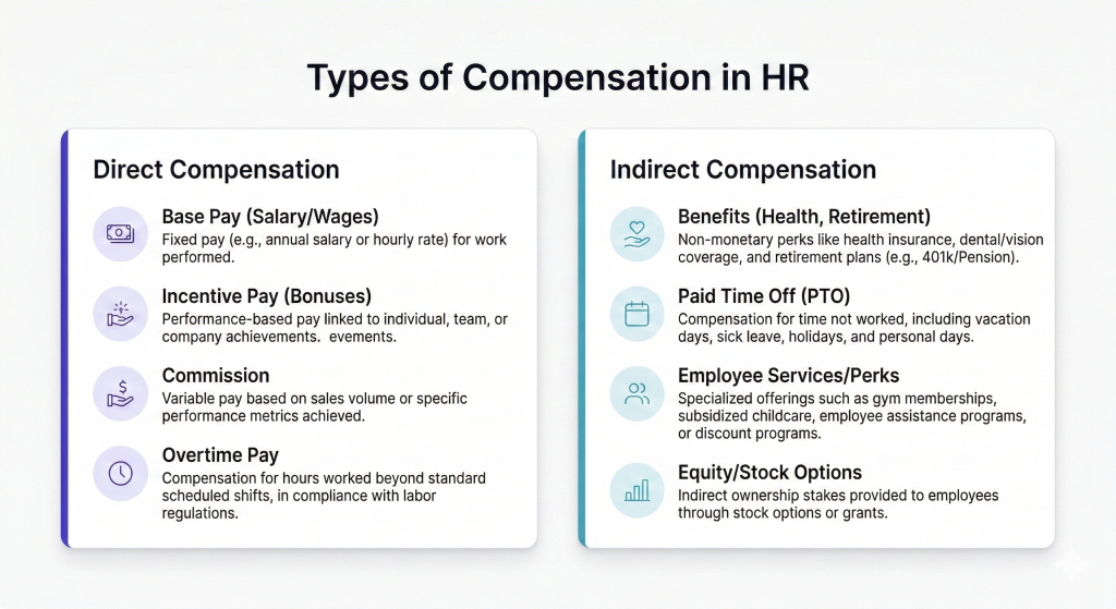Compensation falls into two broad categories. Direct compensation includes base salary, bonuses, commissions, and overtime pay. Indirect compensation covers non-cash rewards like health insurance, retirement plans, paid time off, stock options, and workplace perks. Together, these make up an employee’s total compensation package.