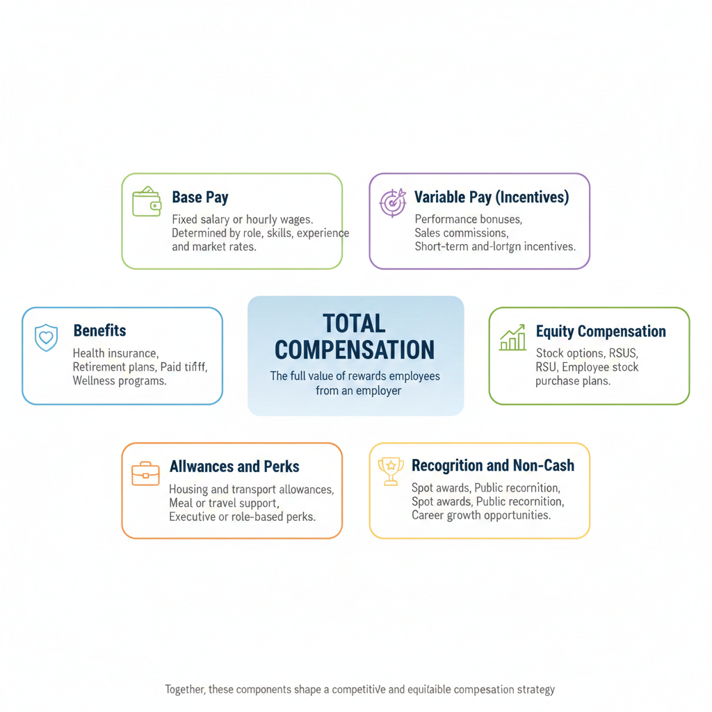 Compensation is a strategic lever that shapes how organizations attract, motivate, and retain talent. It extends beyond fixed pay to include incentives, benefits, equity, allowances, and recognition.