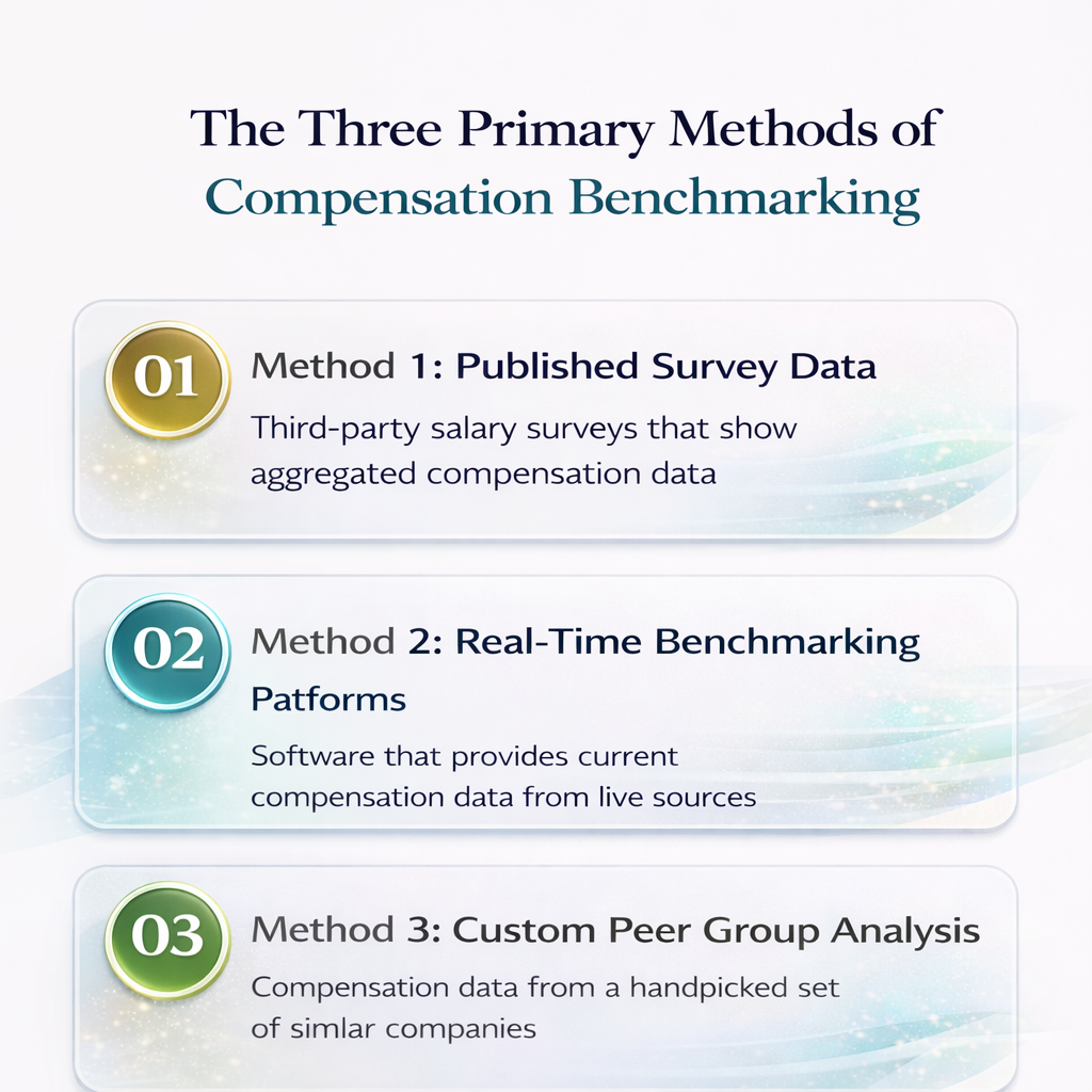 - → The three primary methods are published survey data (rigorous but lagging), real-time platforms (fresh but sometimes limited in coverage), and custom peer group analysis (precise but small sample sizes).